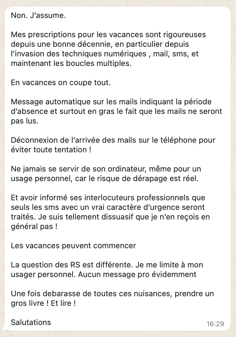 1️⃣ texto de mon ami Vincent. Ulcéré, il fut, lorsque je lui tins ce langage: “t’inquiète, je prends 4 semaines mais je vais bosser un peu tous les deux/trois jours pour la news” . Son message : “arrête”. Moi : “mais, attends…” Lui : ⬇️